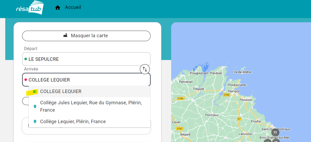 Favori 1 : correspond à un trajet 1 habituel : ex TOURNEMINE > COLLEGE LEQUIER (avec les flèches à droite je viens très facilement intervertir les champs départ/arrivée pour réserver l'ALLER et le RETOUR)